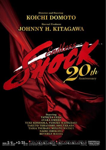 【EndlessSHOCK 2019】・2019.2.4(mon)-3.31(sun) ・帝国劇場(東京都千代田区) [キャスト] ・堂本光一 ・内博貴・福田悠太 ・越岡裕貴* (怪我により休演中、代役は松崎祐介) ・川島如恵留 ・松田元太 ・松倉海斗 ・寺西拓人・梅田彩佳 ・前田美波里 ・石川直 ・日野一輝…